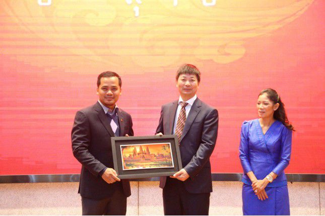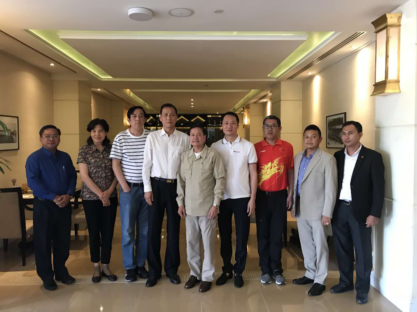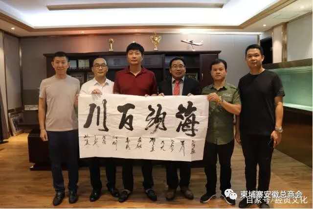 柬埔寨安徽商会会长刘忍(左三)、常务副会长张金风(左一)、副会长刘平生(左二)、副会长张继雷(右一)与...